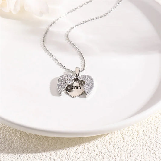 Collier médaillon personnalisé en forme d'aile d'ange pour femmes, noms personnalisés, collier en forme de cœur