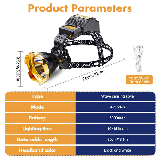 Lampe de poche LED aste super lumineuse, lampe frontale portable, extérieur, chasse, camping de pêche
