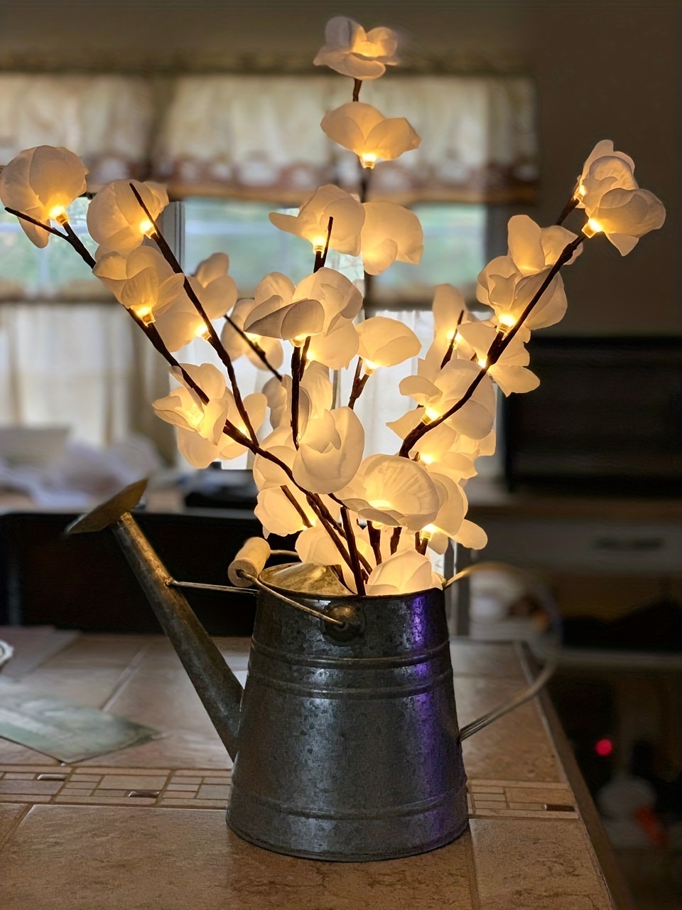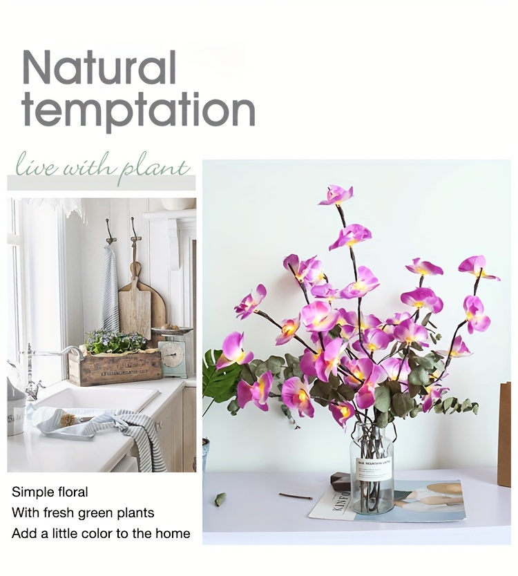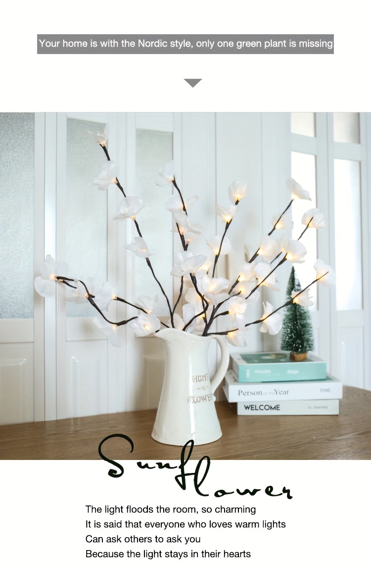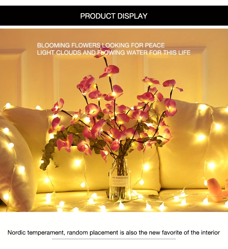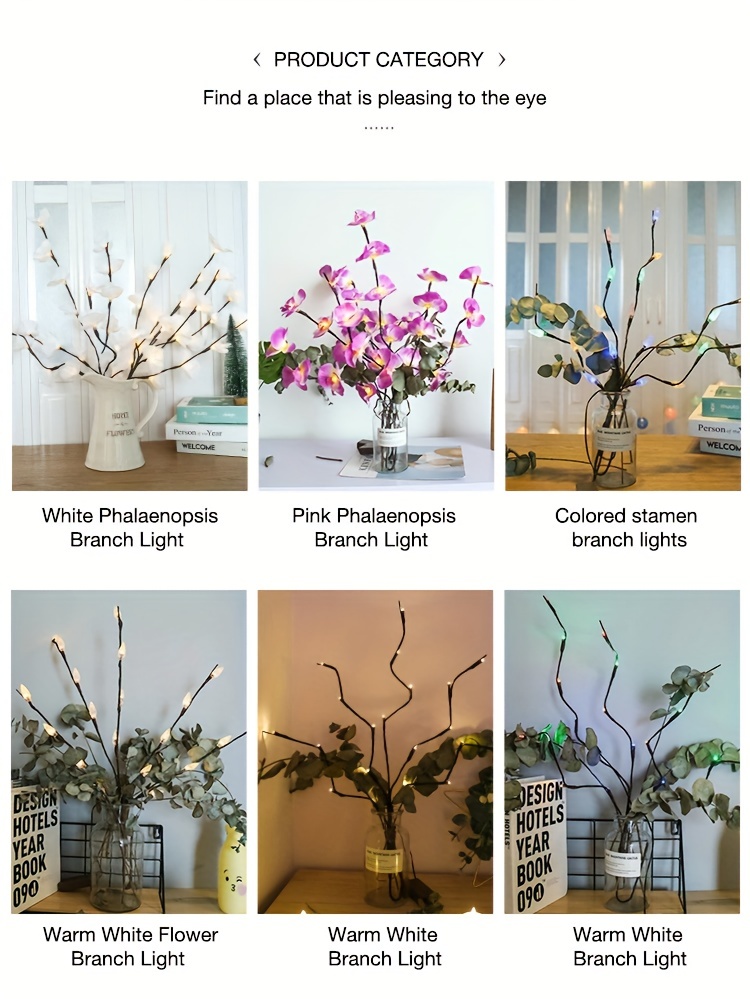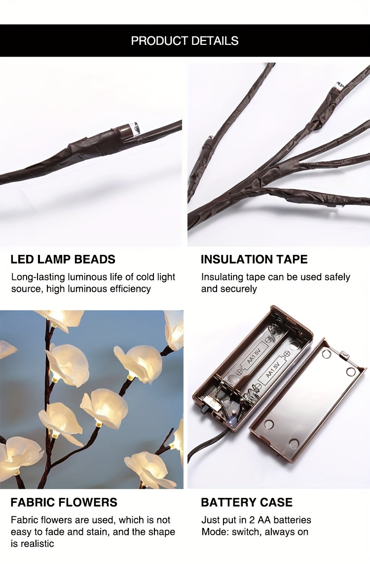 Propriétés de la batterie : Sans batterie Marque : Majisu Mode de couleur : une couleur (pas de blanc, couleur ne changeant pas) Fonctionnalité : Autres fonctionnalités Thème des Fêtes : Automne Jours fériés : Noël ; Nouvel an; la Saint-Valentin ; Universel; Fête des Mères Réf. de l’objet : PF23015 Matériel : Plastique Alimentation : Alimenté par batterie (pas de prise) Modèle : Classique 【Décoration de bricolage】 Toutes les branches sont pliables (la hauteur peut être ajustée en fonction de différents vases de sol, 27,5 pouces de hauteur). Les pétales de l’orchidée peuvent être enlevés. Les branches sont faciles à façonner et à ajuster pour créer votre propre aspect naturel.【Spécification】 1 paquet de lumières de fleurs. Chaque branche avec 5 tiges pliables, 27,5 pouces de hauteur, 20 ampoules chaudes à led, 20 pétales d’orchidée artificielle. La lumière blanche chaude romantique, le look de lampe de fleur blanche vive, fait une chambre de fée. 【Alimenté par batterie】 Nécessite 2 piles AA (non incluses), totalement sûr pour le fonctionnement.【Utilisation intérieure et extérieure】 Ces branches de fleurs éclairées sont une pièce maîtresse sur la décoration de la table du dîner ou du manteau. Parfait comme lumières décoratives pour le salon, la chambre à coucher, la cuisine, la cheminée, la fête, les événements, les salles d’exposition, les galeries, le bureau et n’importe quelle pièce de votre maison.【Cadeau】Ces lumières d’orchidée sont d’excellents cadeaux pour le jour de Thanksgiving, Halloween, Noël, le Nouvel An, etc. Questions et réponses Q : Les 20 bulbes sont-ils sur une branche ou sur cinq branches ?R : Il n’y a qu’une seule branche, mais elle a 5 branches, chacune avec 4 ampoules LED distribuées. Les branches peuvent être pliées à volonté.Q : Quel est le prix ? Combien de branches sont incluses ?R : Le prix est pour une branche, mais il a 5 branches (20 bulbes). Comme le montre l’image, vous aurez peut-être besoin de 4 à 5 branches.Q : Quel type de batterie est requis ?R : Des piles AA sont nécessaires (non incluses).
