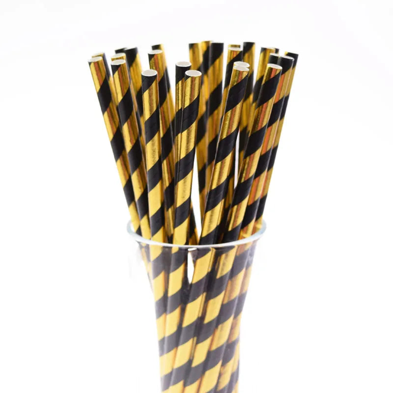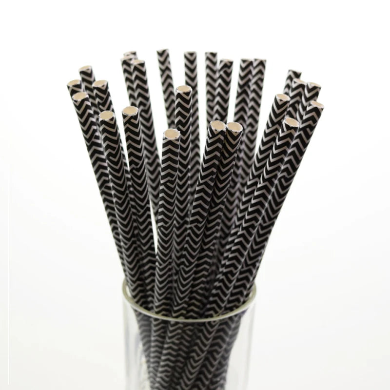 Lot de 25 pailles en papier noir, motif étoiles, rayures, moustache, zèbre, pour décoration de fête prénatale, mariage, anniversaire, Halloween