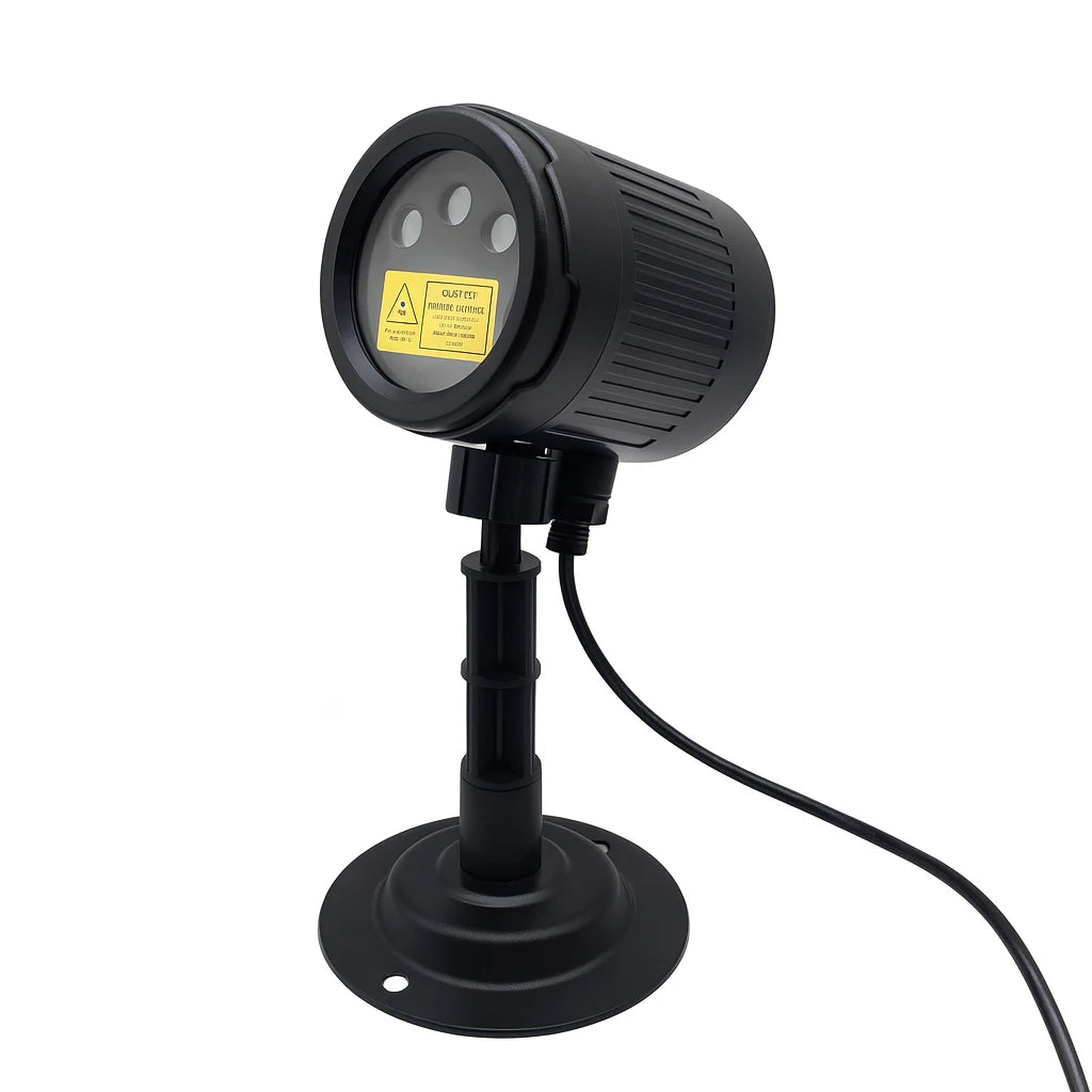 Projecteur laser festif ALIEN compact générant des motifs dynamiques multicolores — points, étoiles et dégradés rouge-vert-bleu — pour transformer espaces intérieurs et extérieurs. Technologie de projection mobile créant des effets lumineux en mouvement continu. Étanchéité certifiée pour installations de jardin, terrasse ou façade. Alimentation batterie 5V incluse avec consommation énergétique minimale (5W), installation autonome sans câblage. Certifications CE, ROHS et UL attestent la sécurité et la qualité. Idéal pour illuminer sapins de Noël, créer ambiances festives ou animer événements en plein air. Modèle SE556 de la marque Alien.