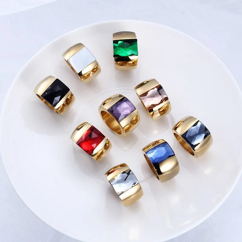Women Fashion Stainless Steel Ring Quality Austrian Crystal Blue Green Red Stone Ring Female Titanium 18K Gold Wedding Ring Band