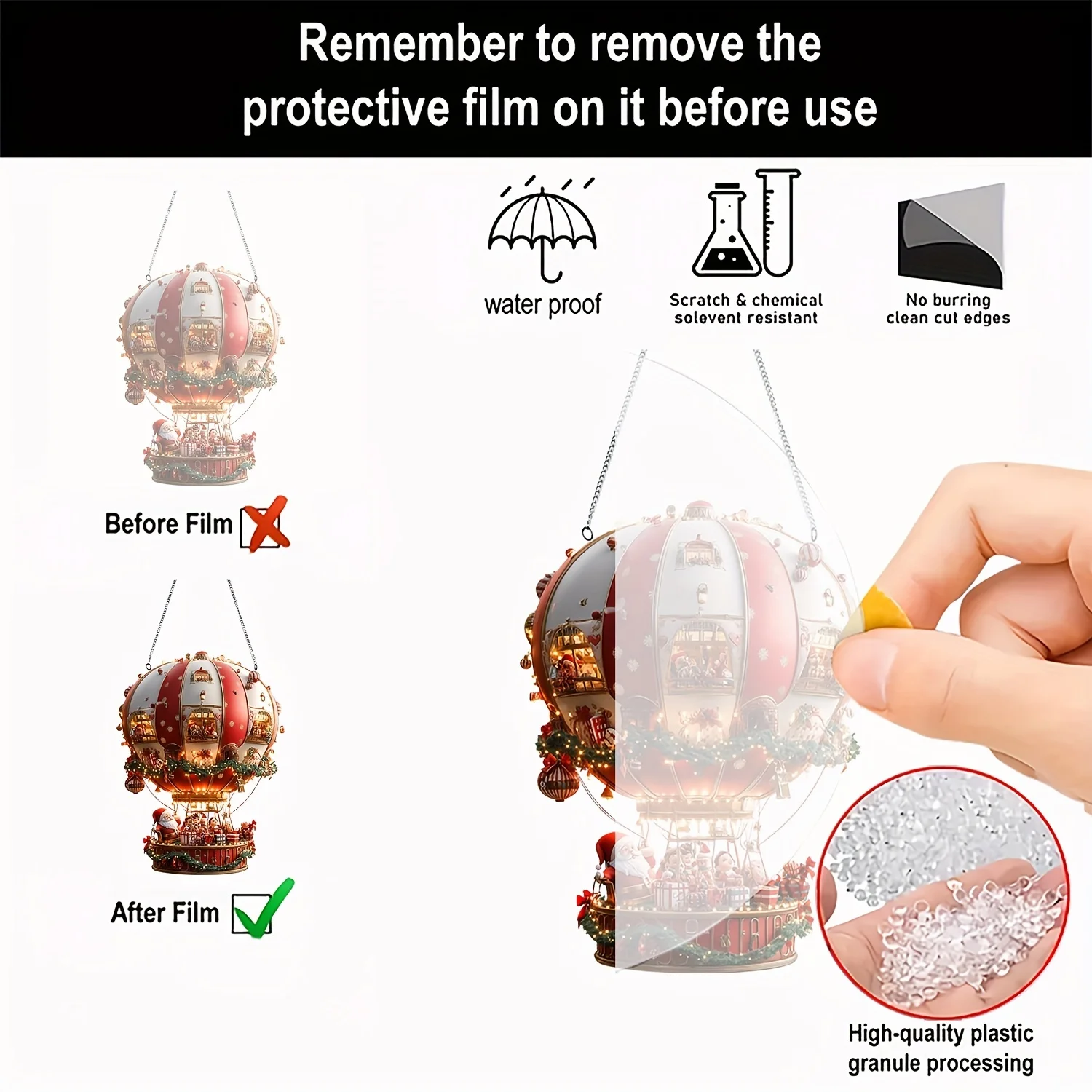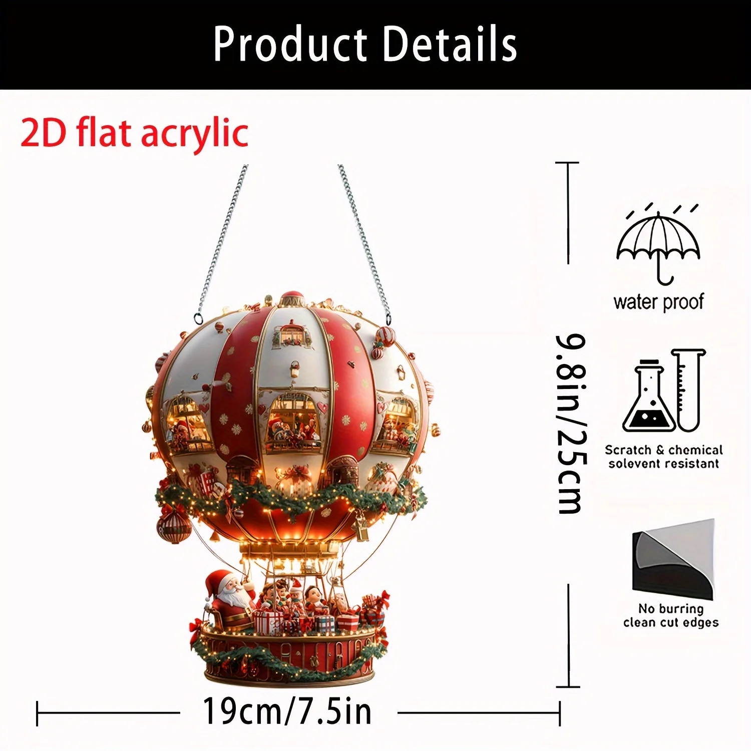 Ornement de Noël en acrylique 2D aux finitions plates, inspiré du design classique des montgolfières. Cet article singulier provient de fabrication chinoise et ne contient aucun composant électronique ni substance chimique préoccupante. Idéal pour personnaliser votre décoration festive avec une pièce de collection distinctive et sans risque pour l'environnement domestique.