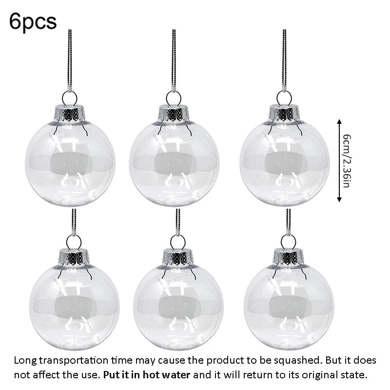 Ensemble de 6 boules de Noël en acrylique transparent disponibles en trois diamètres (6, 8 et 10 cm). Ces ornements polyvalents conviennent aussi bien à la décoration du sapin qu'à l'embellissement de fêtes d'anniversaire et d'événements festifs. Chaque boule est équipée d'une corde d'accrochage pratique. Produit non personnalisé, sans substances chimiques préoccupantes, idéal pour créer une ambiance festive durable dans votre intérieur.