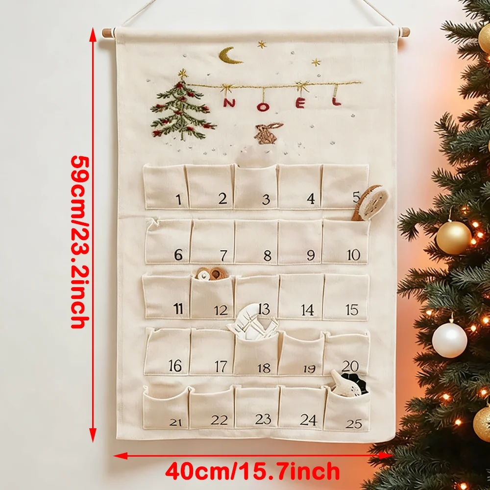 Ce calendrier de l'Avent de Noël est une façon amusante et festive de compter les jours jusqu'à Noël! Doté de 25 poches, il est parfait pour se remplir de petites friandises, de bonbons, de petits jouets ou de messages sincères, créant ainsi une anticipation magique pendant la saison de l'Avent.