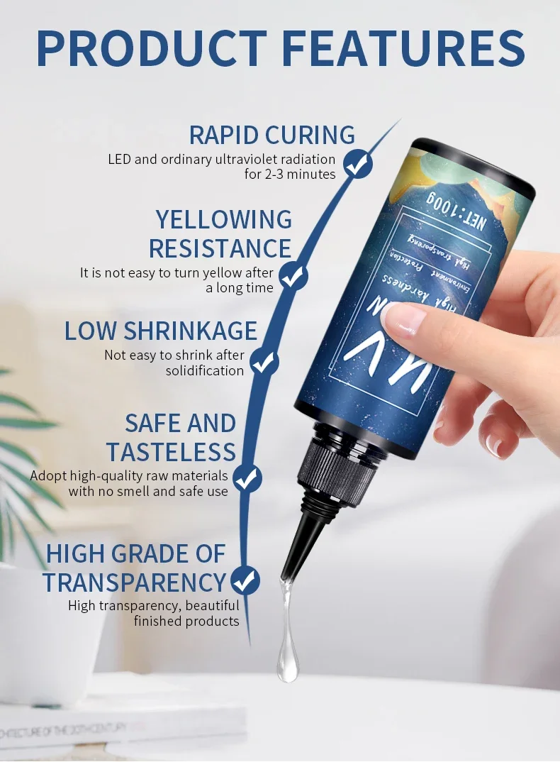 Résine UV adhésive haute performance pour bijoux DIY, disponible en 5 capacités: 20g, 50g, 100g, 250g et 1000g. Formulation transparente et incolore offrant une clarté cristalline exceptionnelle. Durcissement rapide sous lampe UV avec dureté supérieure garantissant des liaisons durables et fiables. Parfaite pour la fabrication de bijoux artisanaux, les réparations et les projets de collage créatifs. Cette résine polyvalente combine transparence optique, rapidité de séchage et résistance mécanique pour des résultats professionnels et durables.