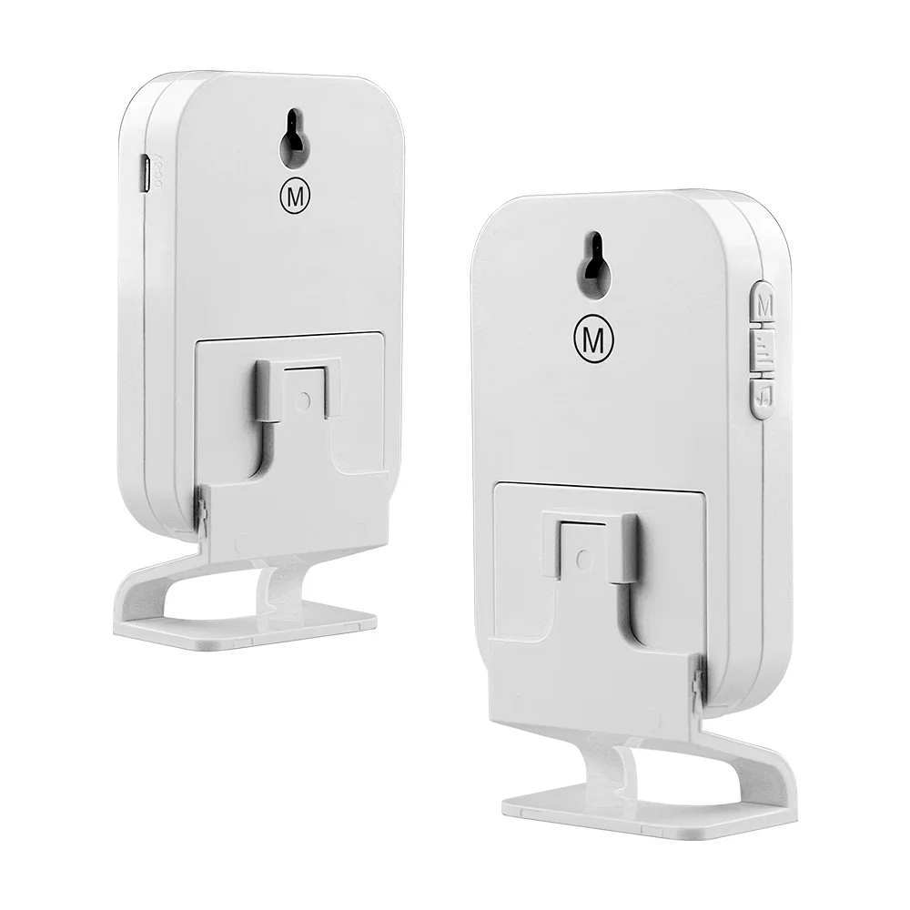 Le récepteur est une conception de sonnette avec 32 sonneries différentes pour les préférences personnelles, appuyez sur le bouton « musique » pour choisir, 4 niveaux de réglage du volume (haut/moyen/bas/muet) de 0 à 80 dB, appuyez sur le deuxième bouton du récepteur pour régler.