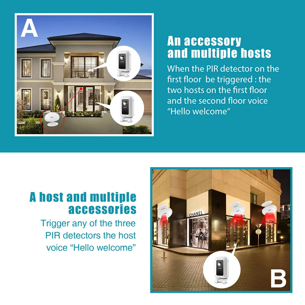 2. Peut être utilisé sur les portes, les portes, les allées, les sentiers pédestres à votre maison, maison, appartement, bureau, hôtel, magasin et bien d'autres endroits intérieurs, ne convient pas à l'extérieur, le système d'alarme de carillon de porte en mouvement sans fonction étanche.
