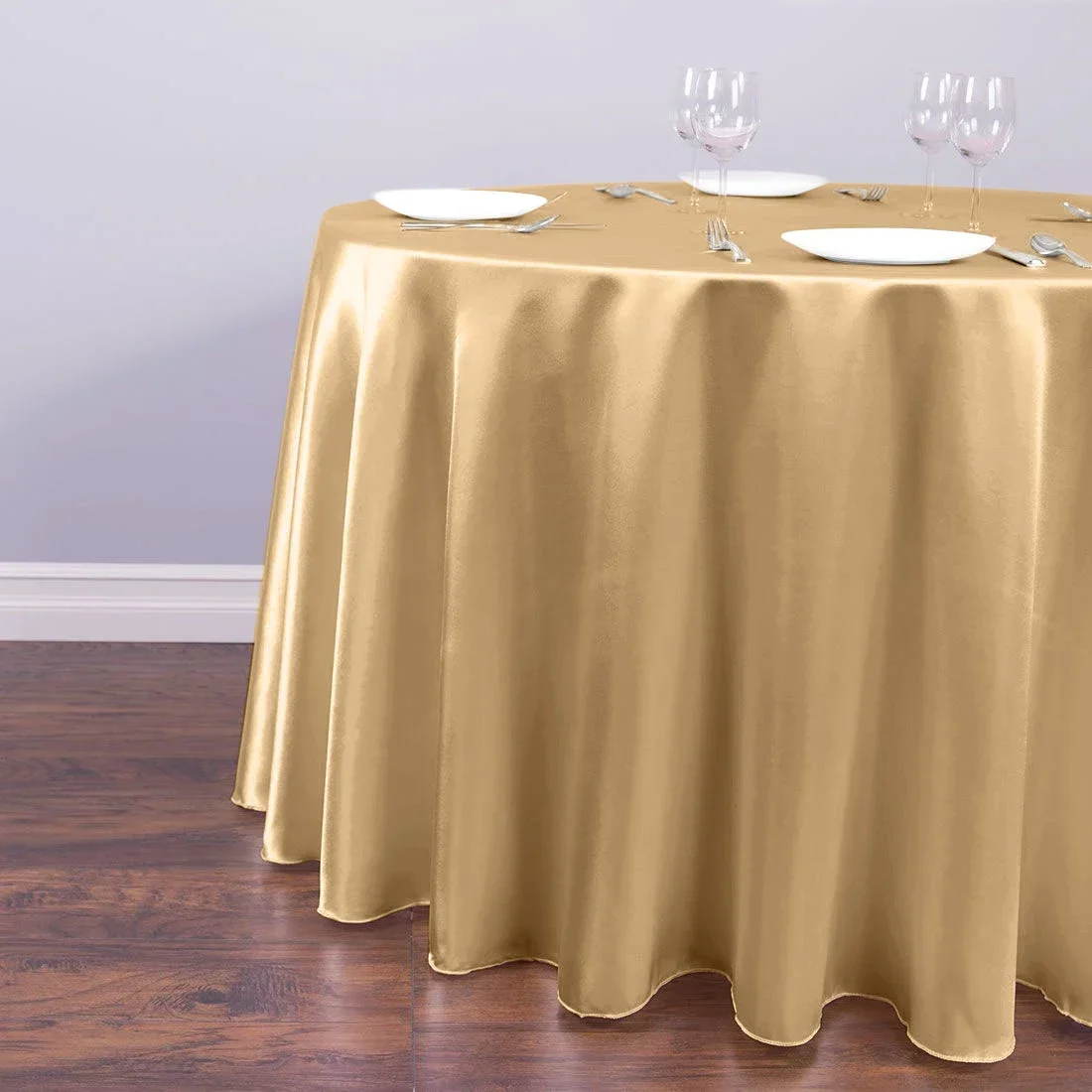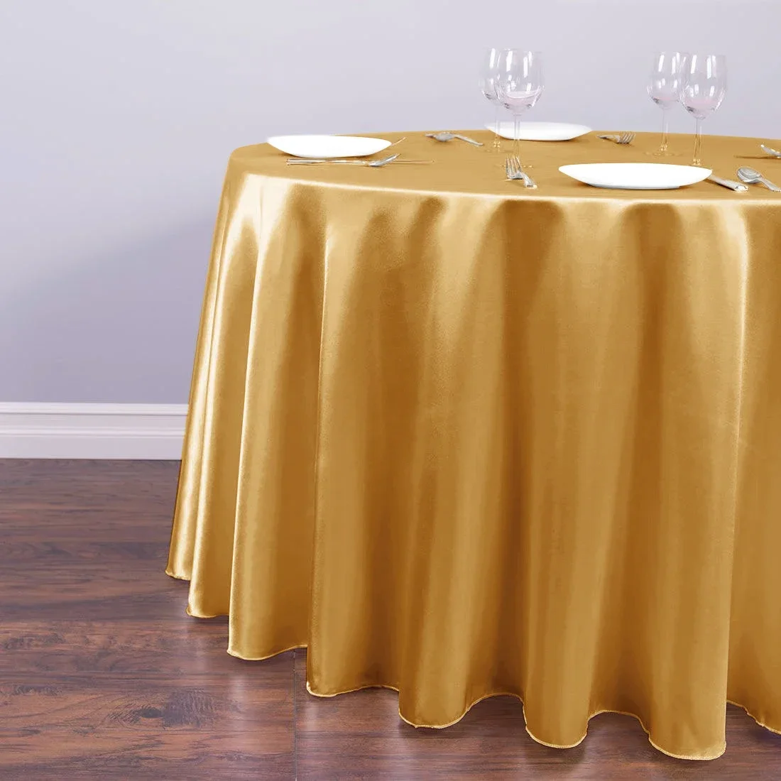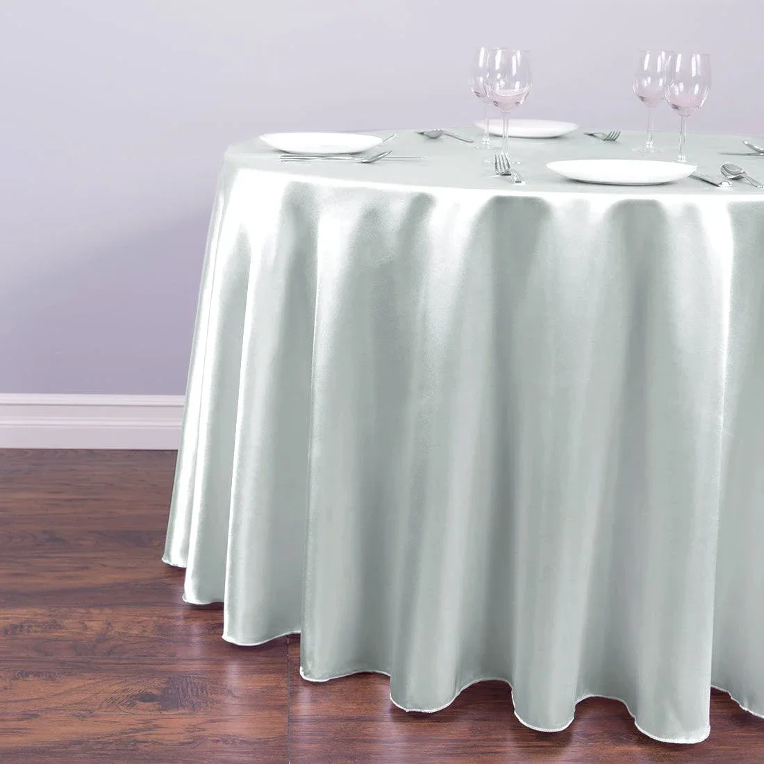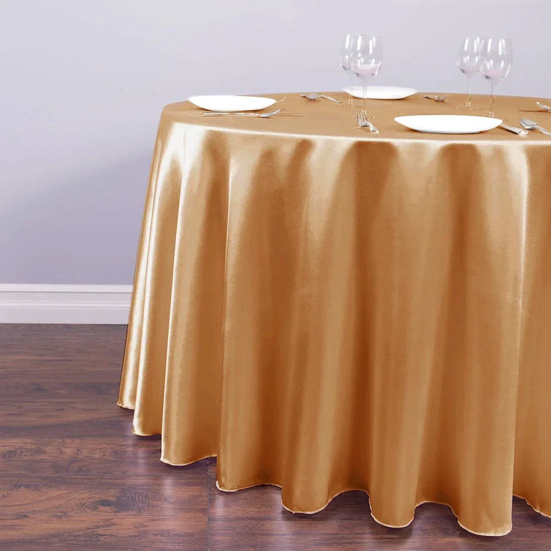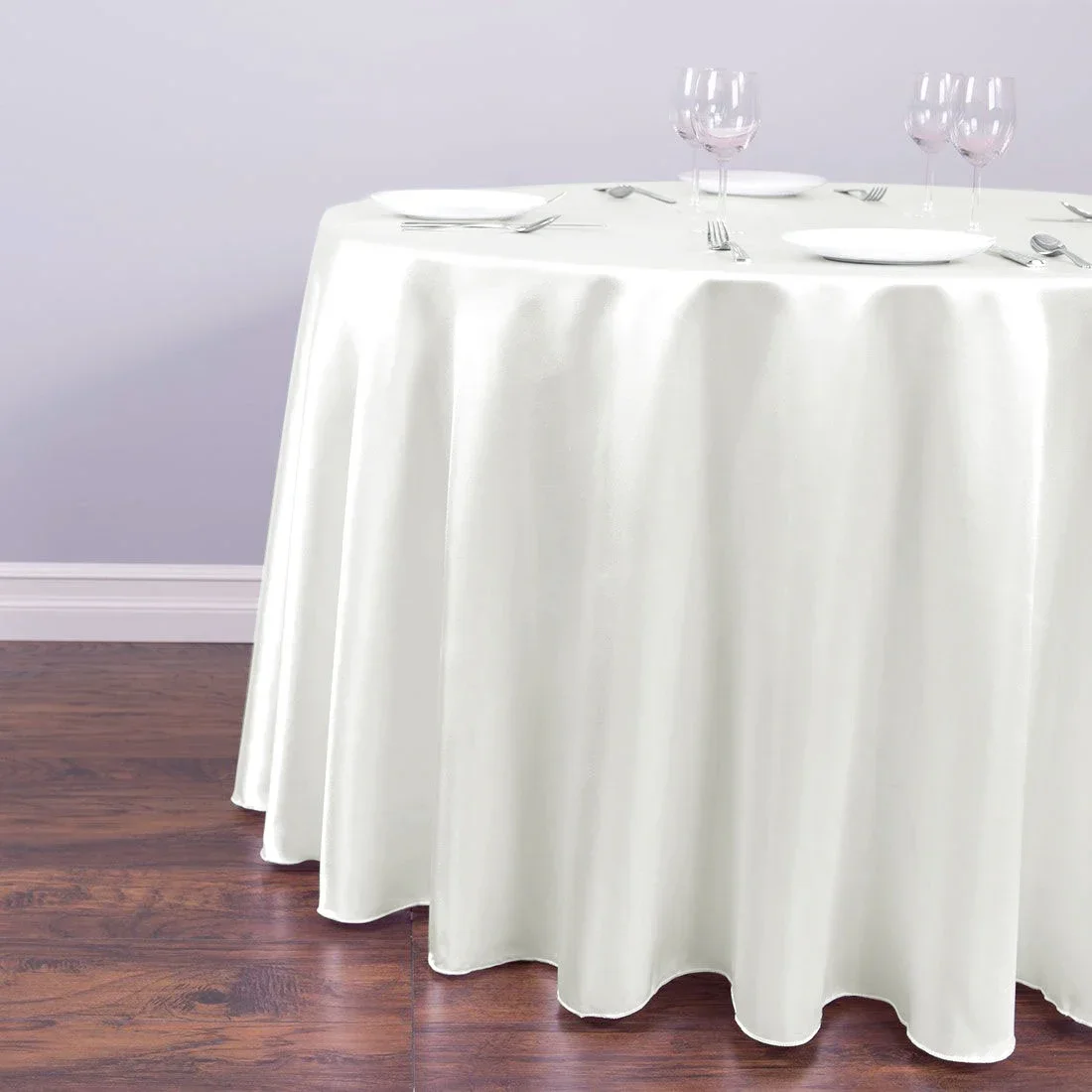 Nappe ronde en satin polyester-coton, lisse et brillante. Imperméable et facile d'entretien au lavage à la main, elle convient parfaitement aux mariages, banquets, hôtels et événements en plein air. Diamètre 120 pouces pour une couverture généreuse de table.